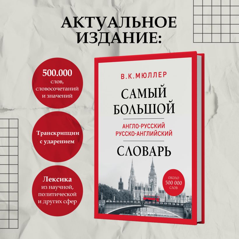 Как найти самый лучший англо-русский словарь? Поделимся лайфхаком — выбирайте проверенный временем и профессионалами. Словарь В. К. Мюллера многие годы рекомендуют педагоги лучших вузов и предпочитают специалисты, ему доверяют изучающие английский язык. Это издание переработано и актуализировано, дополнено лексикой из научных, политических и других сфер жизни. Две части — англо-русская и русско-английская — содержат около 500 000 слов, словосочетаний и значений. Для удобства читателей и исключения ошибок в произношении дана транскрипция с ударениями, соответствующая международной фонетической системе IPA.