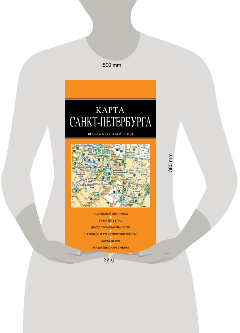 Туристическая карта Санкт-Петербурга с ламинацией для продолжительного использования. Отмечены все основные достопримечательности - на русском языке. Удобный указатель улиц, актуальная схема городского транспорта и указатель станций транспорта.