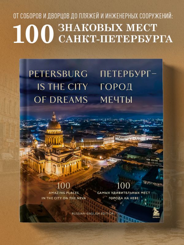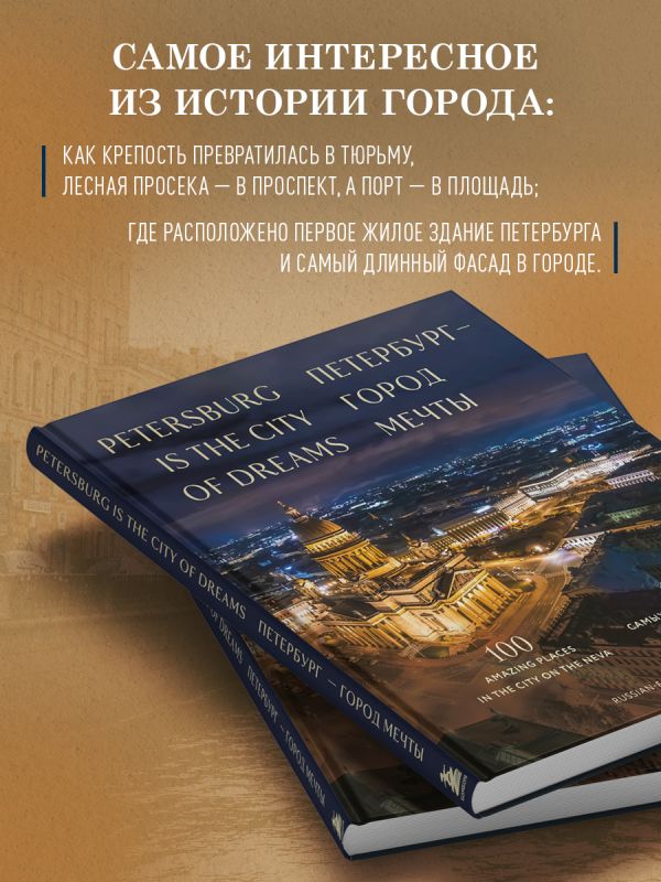 Санкт-Петербург — место с удивительной историей и богатой архитектурой. Двуязычное подарочное издание «Петербург — город мечты. 100 самых удивительных мест города на Неве» расскажет вам об истории культурной столицы через описание самых невероятных и популярных объектов — от Зимнего дворца и Исаакиевского собора до Мариинского театра и особняка Брусницыных.