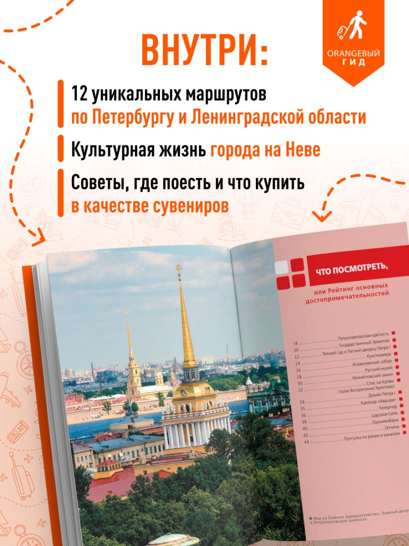 Помимо прогулок по городу, в путеводителе также собраны маршруты по окрестностям Санкт-Петербурга: Петергофу, Ораниенбауму, Стрельне, Кронштадту, парку «Зубровник», Старой Ладоге, Ладожскому озеру и крепости Орешек.