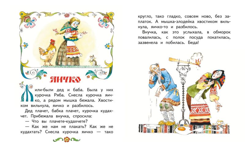 Весёлая шутка-прибаутка «Яичко» написана Анатолием Елисеевым — прекрасным мастером, создавшим яркие и забавные иллюстрации к этой книге. Выдающегося художника вдохновила история знаменитой курочки Рябы, и он увлечённо и искромётно пофантазировал, что же произошло после того, как разбилось золотое яичко.