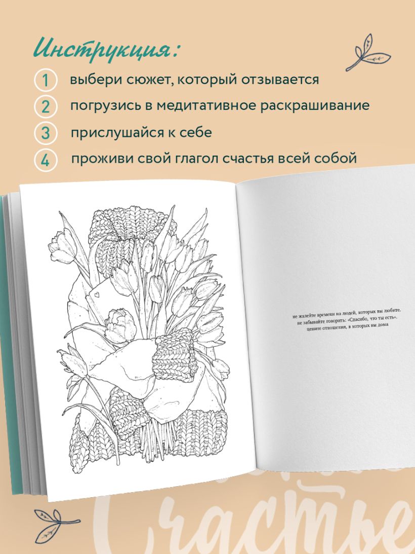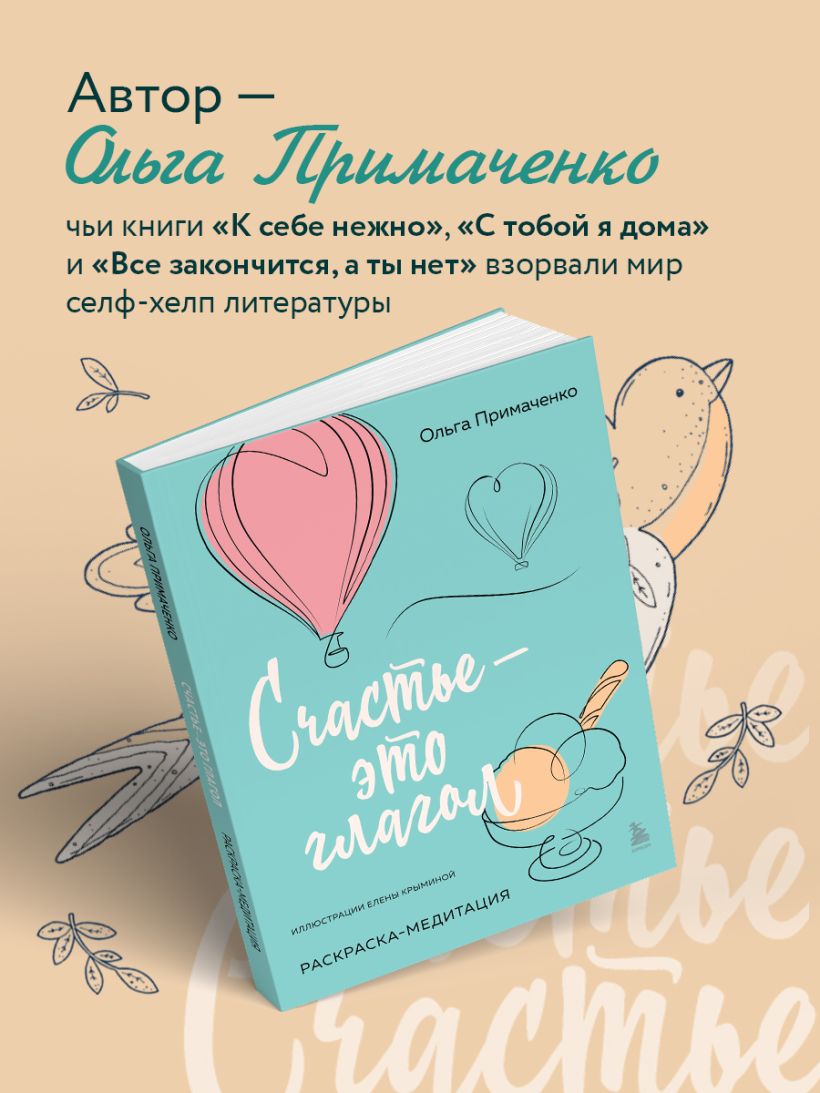 22 РАССЛАБЛЯЮЩИХ СЮЖЕТА, нарисованных талантливой художницей ЕЛЕНОЙ КРЫМИНОЙ, в основе которых — «глаголы счастья» как их видит писательница и психолог ОЛЬГА ПРИМАЧЕНКО, автор бестселлеров «К себе нежно», «С тобой я дома» и «Всё закончится, а ты нет». Ее белые стихи сопровождают каждую иллюстрацию.
