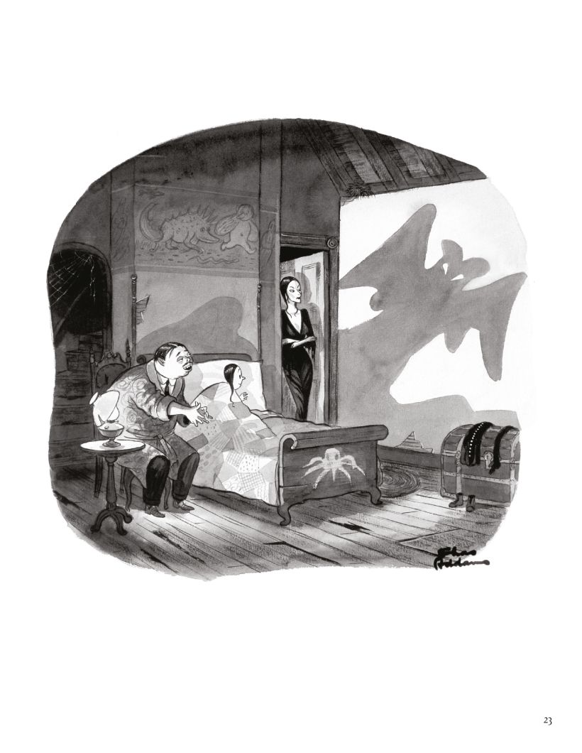 История этой эксцентричной семейки началась задолго до того, как теле- и киноинтерпретации сделали её членов иконами американской массовой культуры. Тогда ещë безымянные, Мортиша, Ларч и Вещь дебютировали в 1938 году в журнале New Yorker. Следующие 26 лет клан обрастал плотью и кровью и множился числом в рисунках его демиурга. В 1964 году Аддамсы покорили малые экраны на телеканале ABC, а в 1991-м появились и на больших.