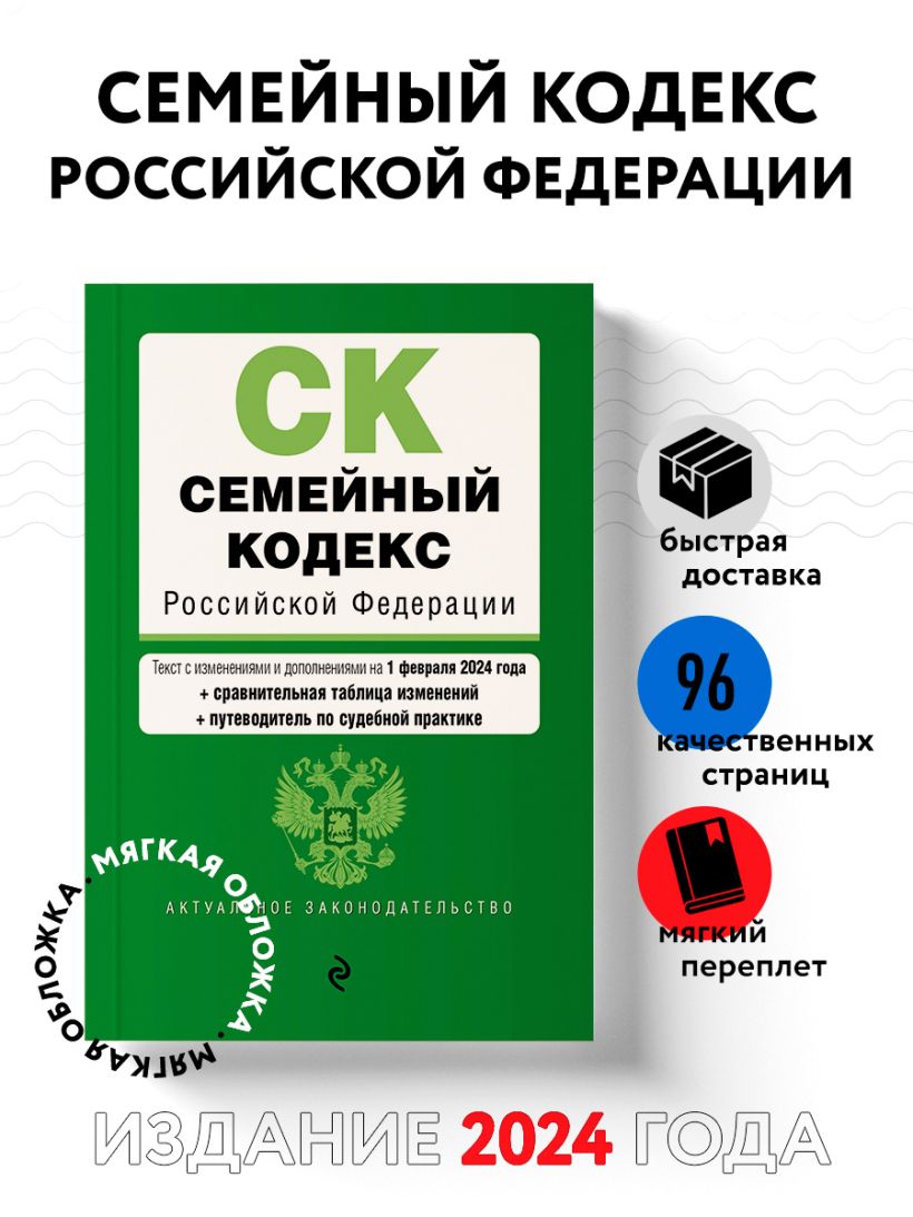 Настоящее издание содержит текст Семейного кодекса Российской Федерации с изменениями и дополнениями на 1 февраля 2024 года с удобной навигацией и таблицей изменений. Если есть изменения, вступающие в силу позднее, то вместе с редакцией нормы, действующей на эту дату, приводится норма в новой редакции и указывается дата, с которой она вступает в силу.