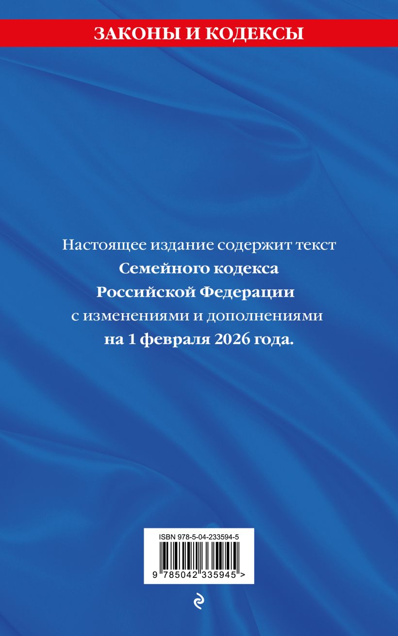 Настоящее издание содержит текст Семейного кодекса Российской Федерации с изменениями и дополнениями на 1 февраля 2026 года с удобной навигацией и таблицей изменений. Если есть изменения, вступающие в силу позднее, то вместе с редакцией нормы, действующей на эту дату, приводится норма в новой редакции и указывается дата, с которой она вступает в силу.