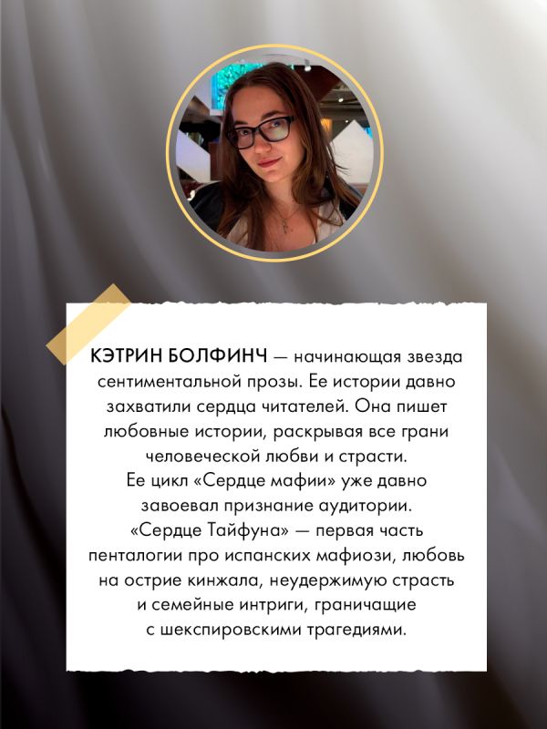 Кэтрин Болфинч – начинающая звезда сентиментальной прозы. Ее истории давно захватили сердца читателей. Она пишет любовные истории, раскрывая все грани человеческой любви и страсти. Ее цикл «Сердце мафии» уже давно завоевал признание аудитории. «Сердце Тайфуна» - первая часть пенталогии про испанских мафиози, любовь на острие кинжала, неудержимую страсть и семейные интриги, граничащие с шекспировскими трагедиями.