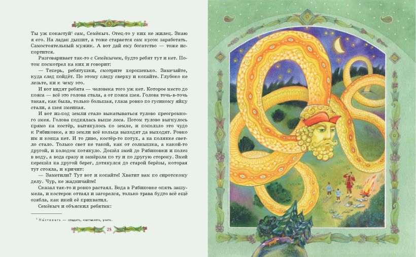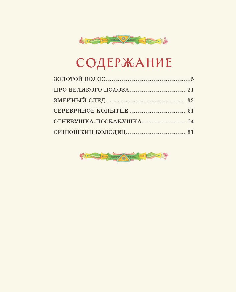 В книгу вошли шесть сказов: «Золотой Волос», «Про Великого Полоза», «Змеиный след», «Серебряное копытце», «Огневушка-Поскакушка», «Синюшкин колодец». Стильные и выразительные иллюстрации Елены Шафранской открывают нам и сказочный мир башкирских народных преданий, и повседневную жизнь уральских старателей.