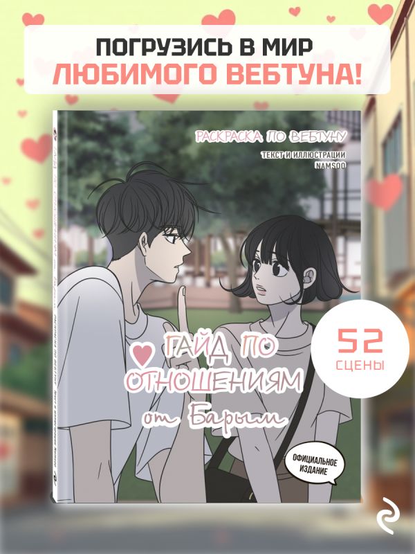 "Гайд по отношениям от Барым. Раскраска по вебтуну" — сборник из 52 романтических сцен популярного вебтуна. На разворотах представлены оригинальные иллюстрации и контуры для раскрашивания, позволяющие передать атмосферу истории и прочувствовать эмоции героев. Плотная бумага и крупные изображения делают творческий процесс комфортным и увлекательным.