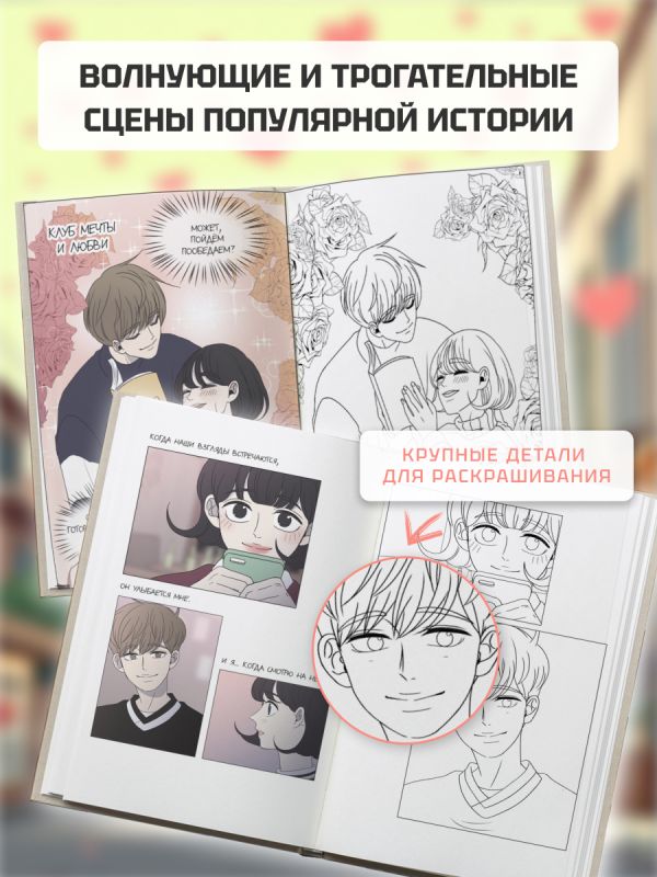 Раскрашивая сладкие и нежные моменты, которые удовлетворят мечты каждого — первую встречу Чон Ба Рым и цундере На Ю Ён, трогательное признание Ю Ён, их свидание, — ты сможешь прочувствовать эмоции героев. На левой странице представлены оригинальные иллюстрации из вебтуна для удобства раскрашивания. Создай собственный шедевр, используя любые оттенки!