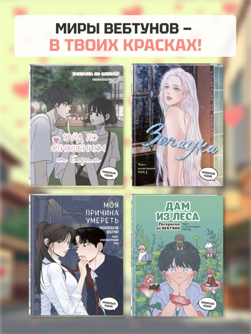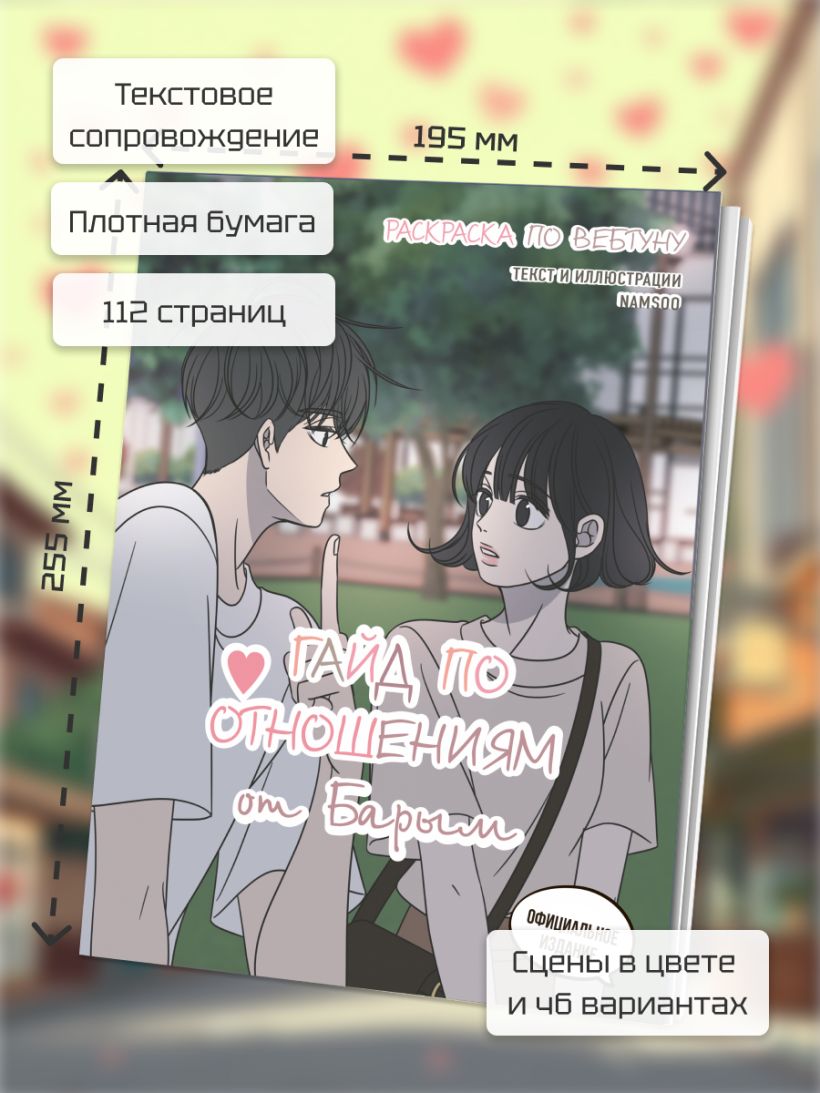 «Гайд по отношениям от Барым. Раскраска по вебтуну» — это сборник из 52 сцен популярного романтического вебтуна «Гайд по отношениям от Барым», который, как говорят читатели, способен оживить даже «уснувшие» клетки любви.