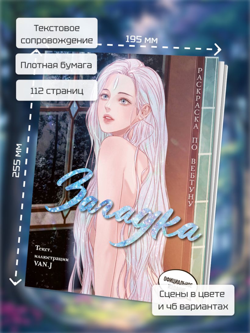 "Загадка. Раскраска по вебтуну" — сборник из 52 ключевых сцен романтического вебтуна "Загадка", покорившего читателей сказочной атмосферой и выразительным рисунком. На разворотах представлены оригинальные кадры и контуры для раскрашивания, позволяющие передать эмоции героев и создать собственные цветовые решения. Плотная бумага и крупные иллюстрации обеспечивают комфортный и вдохновляющий творческий процесс.