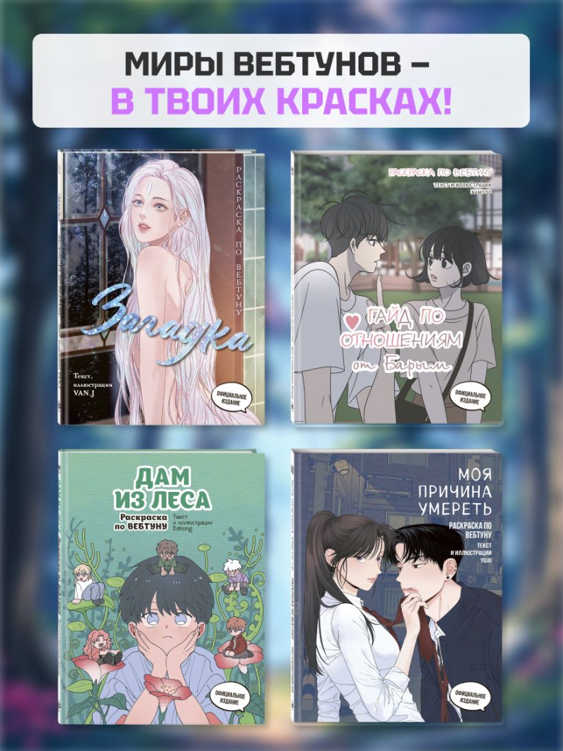 «Загадка. Раскраска по вебтуну» — это сборник раскрасок по мотивам популярного романтического вебтуна «Загадка», который покорил сердца многих своей сказочной историей, прекрасными рисунками и незабываемыми диалогами.