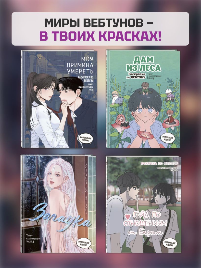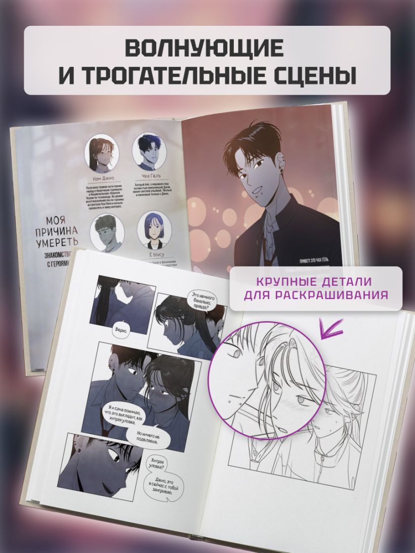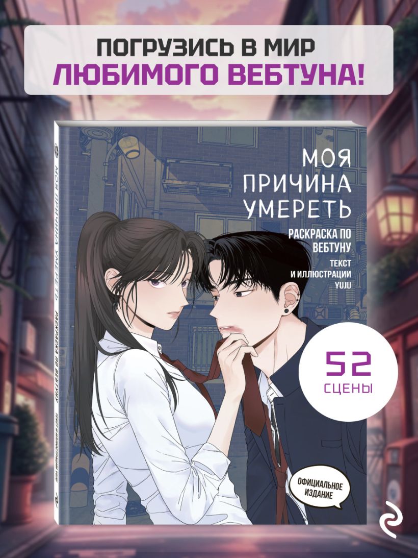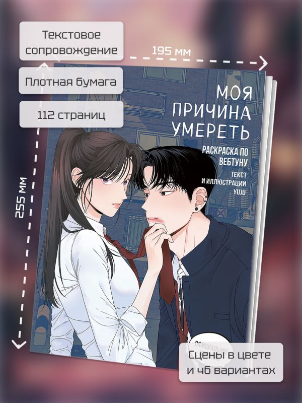 "Моя причина умереть. Раскраска по вебтуну" — сборник из 52 выразительных кадров популярного вебтуна YUJU. На разворотах представлены оригинальные сцены и контуры для раскрашивания, позволяющие передать атмосферу истории и прочувствовать эмоции героев. Плотная бумага и крупные изображения обеспечивают комфортный творческий процесс.