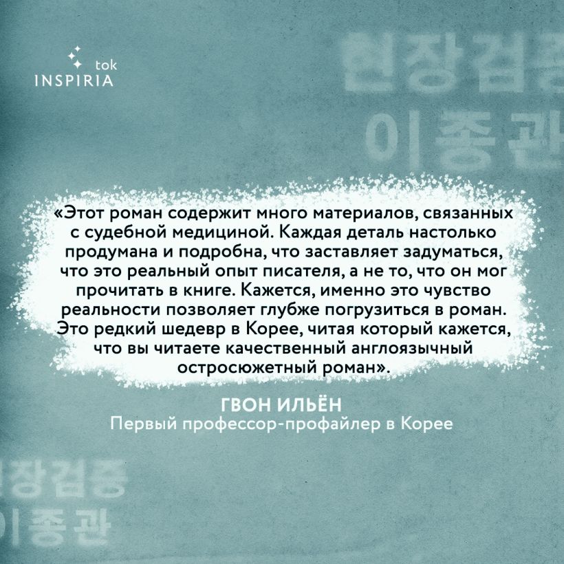 «Этот роман содержит много материалов, связанных с судебной медициной. Каждая деталь настолько продумана и подробна, что заставляет задуматься, что это реальный опыт писателя, а не то, что он мог прочитать в книге. Кажется, именно это чувство реальности позволяет глубже погрузиться в роман. Это редкий шедевр в Корее, читая который кажется, что вы читаете качественный англоязычный остросюжетный роман». — Гвон Ильён (первый профессор-профайлер в Корее)