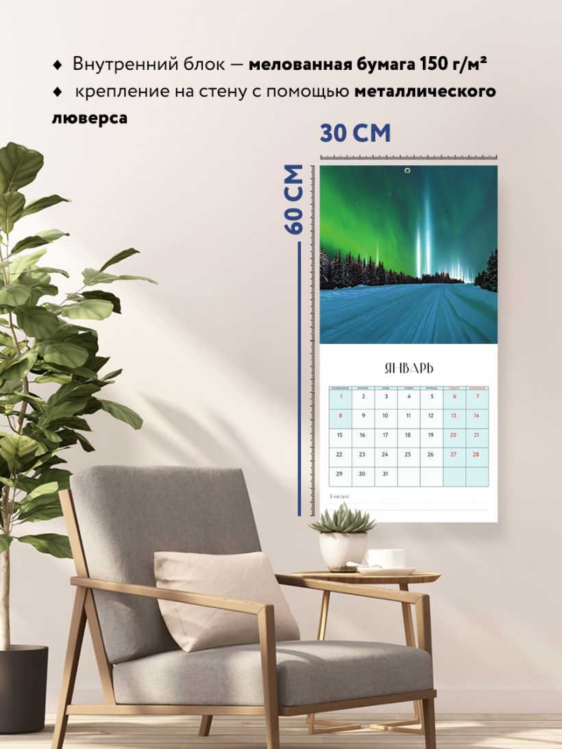 Наши настенные календари отличаются высоким качеством исполнения! Тщательно подобранные иллюстрации, напечатанные на глянцевой бумаге высочайшего качества, станут настоящим украшением дома, а в календарной сетке найдется место для ваших планов: большие клетки позволят делать записи и организовать свой год! В календаре также отмечены все государственные праздники.