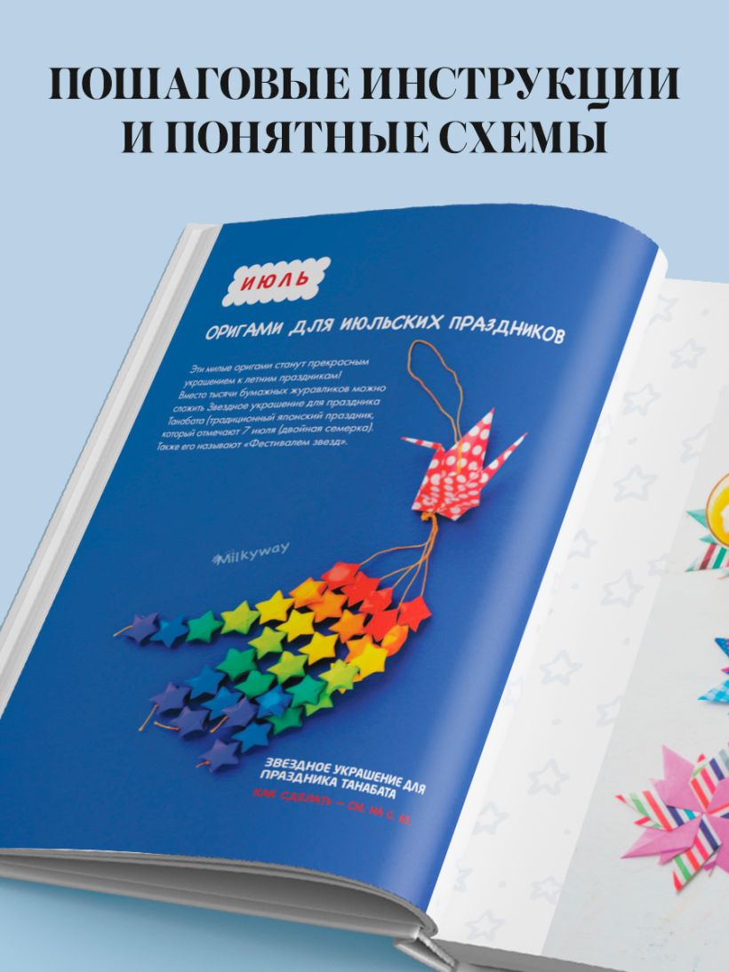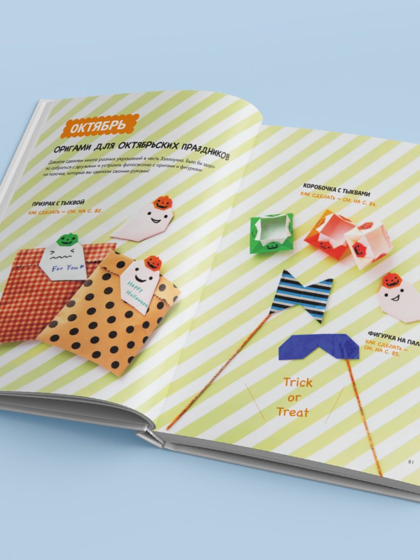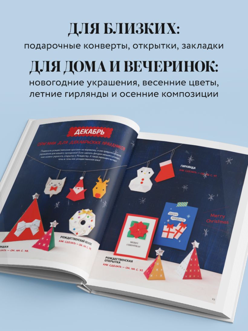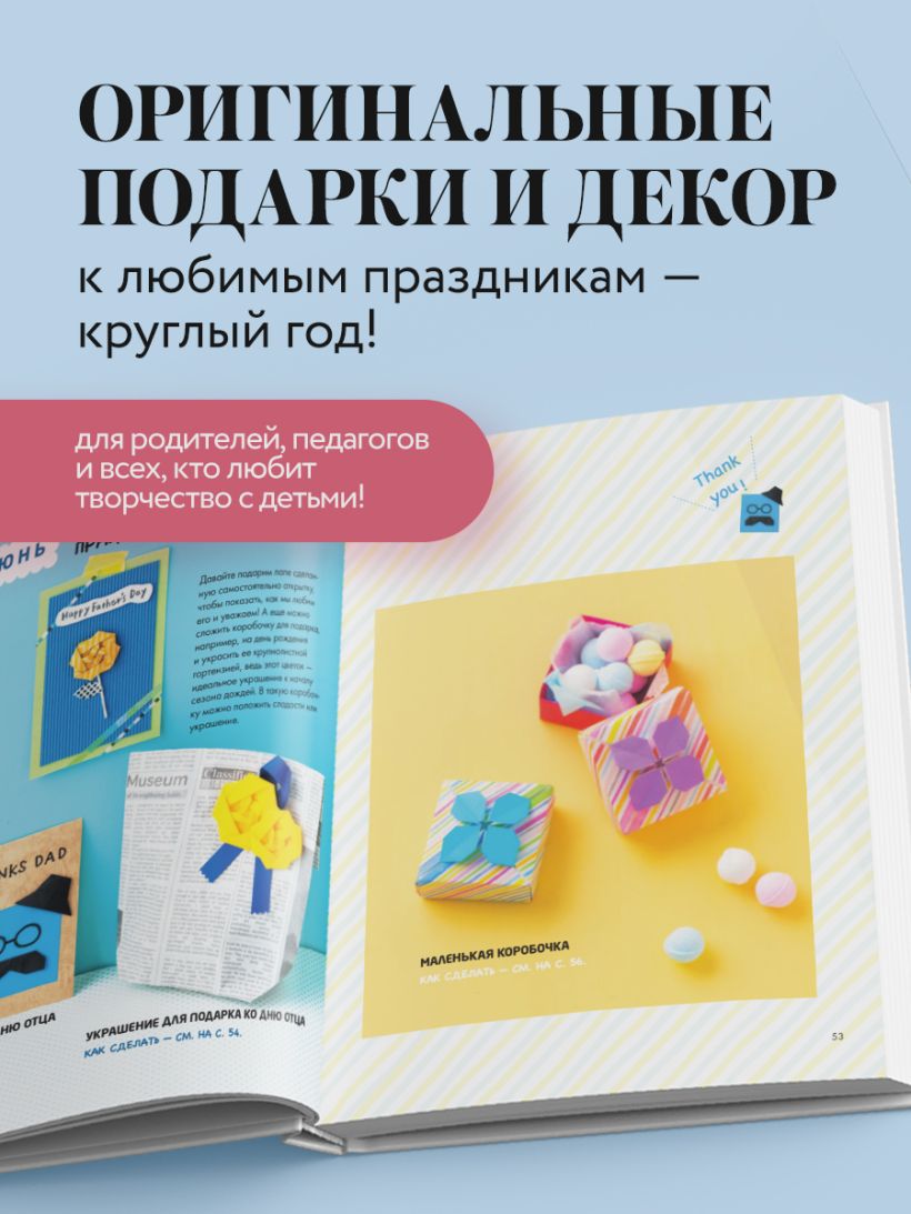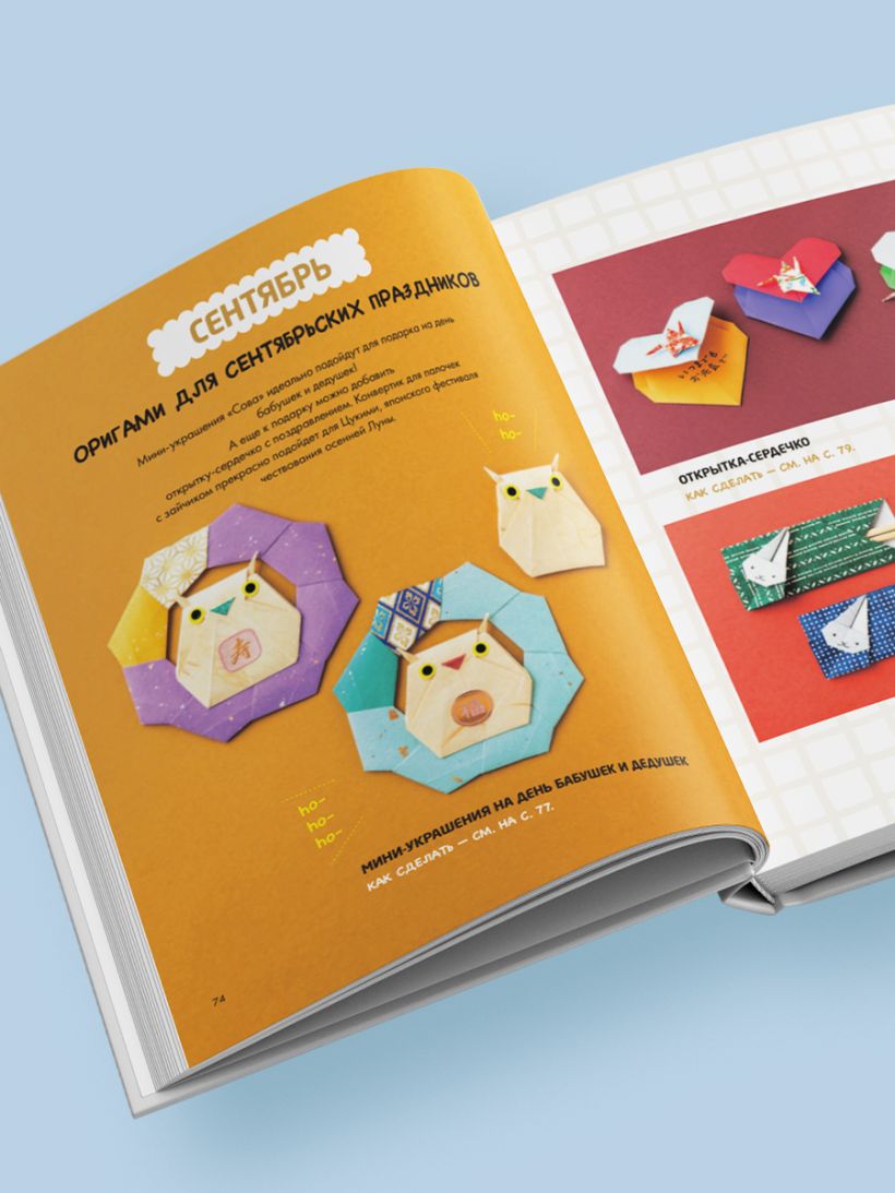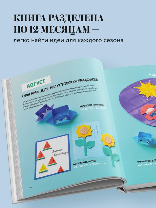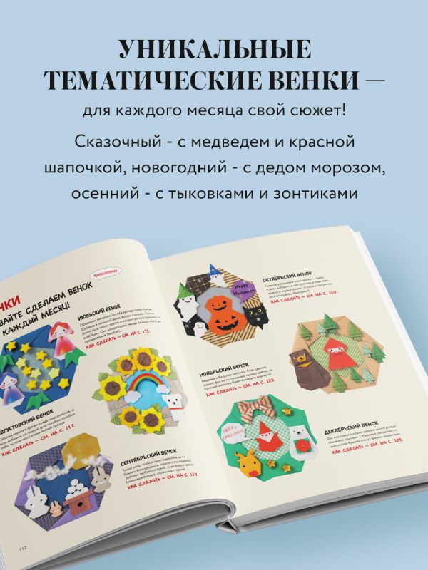 Ваш ребенок откроет волшебный мир оригами, в котором каждое время года приносит новые идеи для творчества! По пошаговым мастер-классам вы сложите из бумаги более 60 удивительных декораций и подарков, которые будут радовать каждый день. Все разделы посвящены 12 месяцам, каждый из которых добавит яркости семейным праздникам и поможет провести их весело, складывая оригами. Ваш ребенок научится складывать не только простые 2D-оригами, но и объемные и даже модульные фигуры! А если объединить несколько фигурок, вы получите уникальные венки со сказочными мотивами, забавными персонажами и сюжетами.