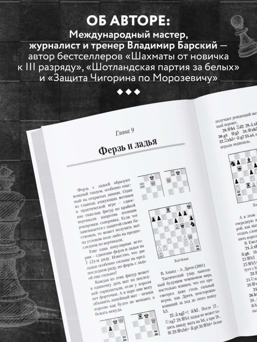 Международный мастер, журналист и тренер Владимир Барский — автор множества шахматных бестселлеров, включая «Шахматы от новичка к III разряду», «Шотландская партия за белых» и «Защита Чигорина по Морозевичу». Его новая книга — полный сборник матовых комбинаций!