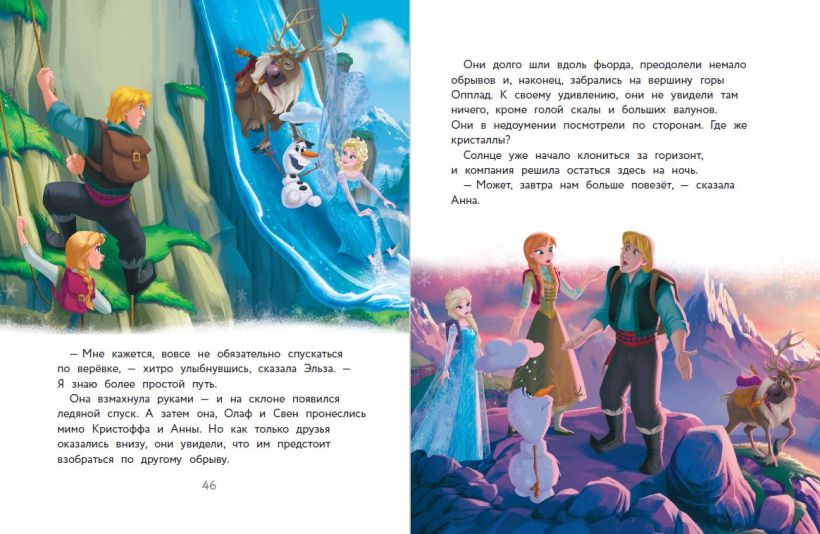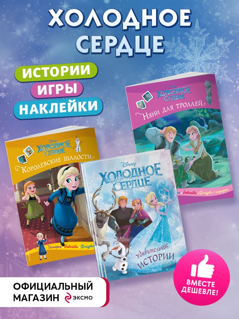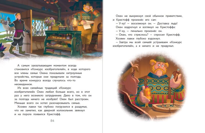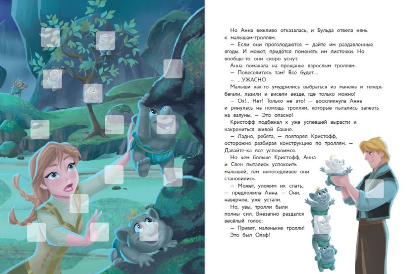Отправляйся в заснеженные горы с Эльзой, чтобы вернуть магическому кристаллу троллей былое сияние, прими участие в конкурсе ледовых скульптур вместе с Олафом, прочти об удивительном изобретении бродяги Окена, придумай подарок на день рождения Свена и узнай, как Анне пришлось управлять королевством, а Кристоффу – стать няней для маленьких троллей…