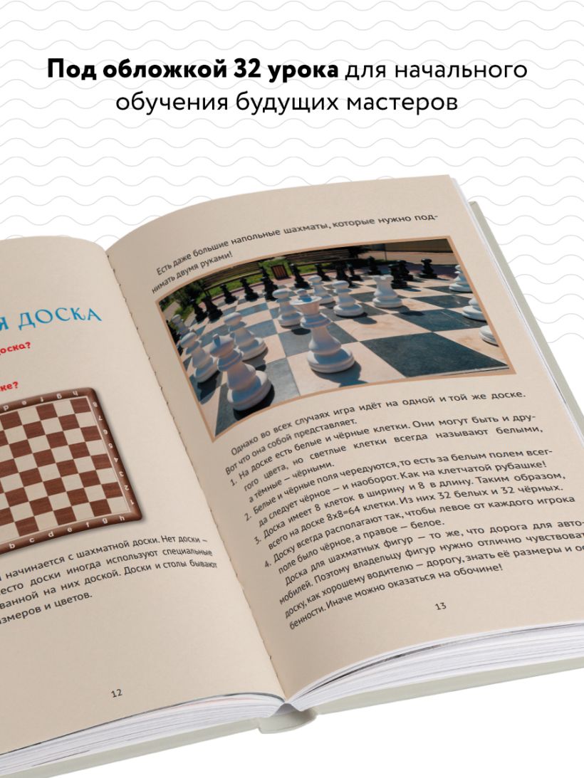 Учебник состоит из 32-х уроков по 45 минут, с подробными схемами и понятными иллюстрациями. Также в учебник включены интересные и познавательные факты из истории шахматной игры.