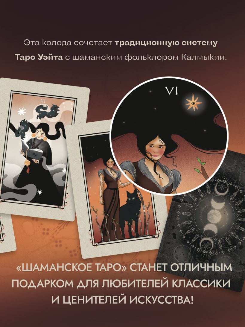 Колода карт «Шаманское Таро» сочетает традиции и символизм классической колоды Райдера-Уэйта, калмыцкий шаманский фольклор и авторский стиль художницы Баиры Буваевой. Героями этой колоды стали шаманы и шаманки, духи волшебного леса и волки — хранители врат между реальным и потусторонним миром.