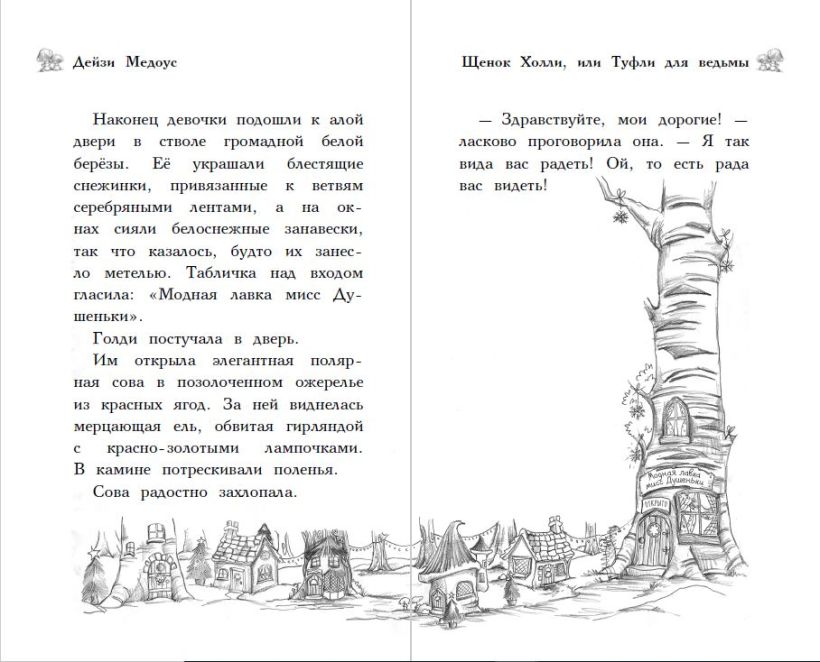 Это специальное новогоднее издание с красивой обложкой, на которой будто бы переливается снег. Внутри белая бумага и крупный шрифт, который удобно читать, и прекрасные чёрно-белые иллюстрации.