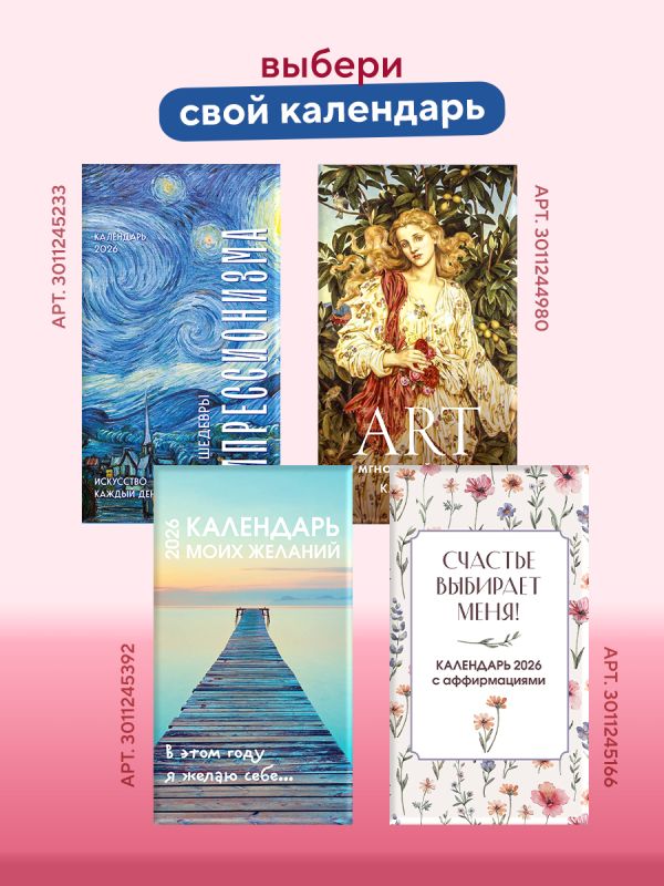 Каждая девушка мечтает о том, чтобы её желания стали реальностью. И 2026 год создан именно для этого — год исполнения самых заветных мечт! Календарь станет твоим ежедневным источником вдохновения, помогая осознанно формулировать свои желания и шаг за шагом приближаться к ним. Каждая страница — это не просто дата, а новый шанс загадать что-то важное: от великих целей до маленьких радостей. Путешествия, развитие, любовь, гармония или даже бриллианты — всё возможно! Отрывай листок, загадывай желание и визуализируй его с помощью ярких, вдохновляющих фотографий, тщательно подобранных для мотивации и поддержки. Пусть каждый день напоминает тебе: ты достойна самого лучшего. Как это работает? ✨ Утро с аффирмацией — задаёт тон дню. ✨ Моменты рефлексии — помогают остановиться и услышать себя. ✨ Постепенная трансформация — слова становятся убеждениями, а убеждения — твоей новой реальностью. Преимущества: - Удобный формат (80х140 мм) — поместится на рабочем столе или тумбочке. - Листы с перфорацией — аккуратно отрывай страницу за страницей, создавая ритуал обновления. - Плотная бумага (115 г/м²) — приятная на ощупь, подходит для заметок карандашом или ручкой. - Подставка в комплекте — для красивого размещения на столе. Ты заслуживаешь всего, о чём мечтаешь. Живи ярко! Мечтай смело! Получай желаемое!