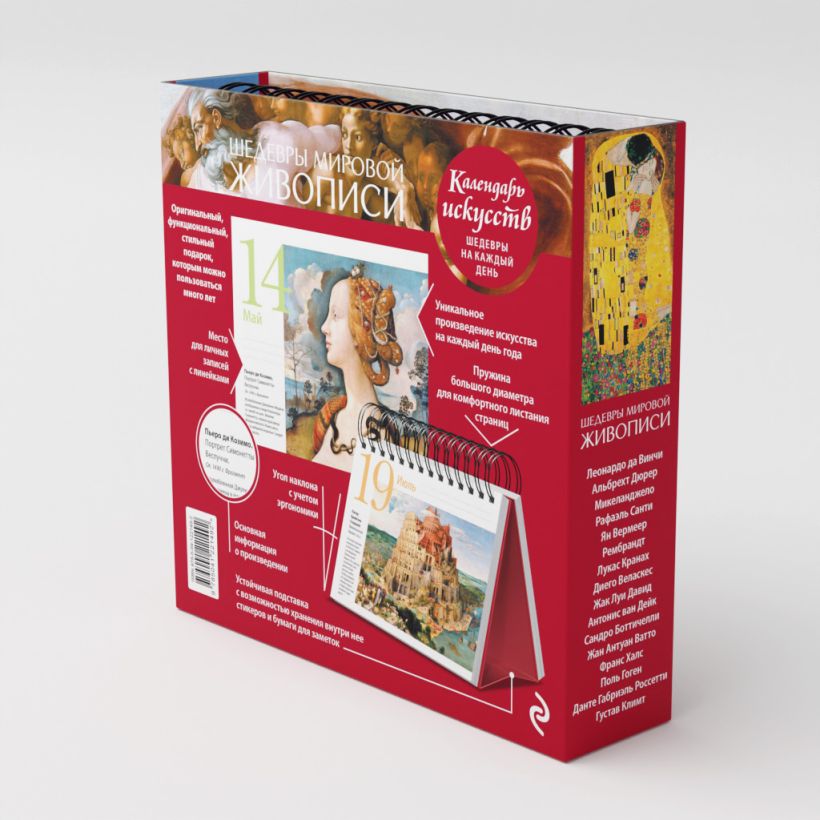 В подарочном календаре «Шедевры мировой живописи» представлены великие произведения изобразительного искусства: живопись ранних веков с присущей ей символической недосказанностью, блестящий расцвет красоты искусства Ренессанса, изощренная декоративность барокко, галантная чувственность рококо, возвышенная и благородная страстность республиканского и имперского классицизма, смелые художественные эксперименты Нового и Новейшего времени.