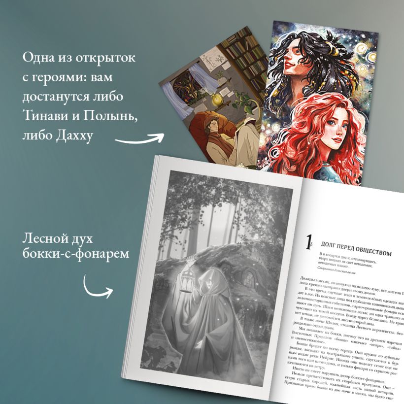 Приятным бонусом к книге станет открытка с героями: вам достанутся либо Тинави и Полынь, либо Дахху.