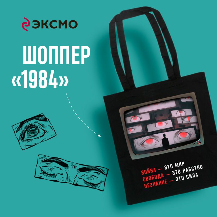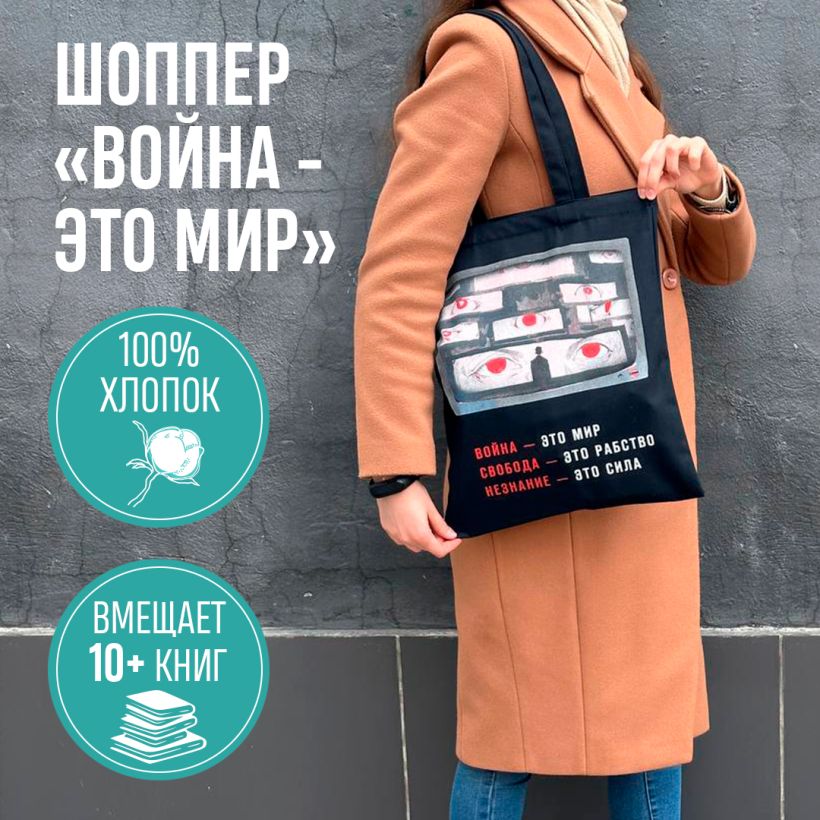 Сумка шоппер «1984» («Война — это мир») сделана из плотного натурального хлопка и отличается износостойкостью. Удобная длина ручек. Иллюстрация на шоппере вдохновлена знаменитым романом Джорджа Оруэлла «1984» и отсылает к одноименному изданию в серии «Подарочное издание. Знаменитая классика с иллюстрациями». В шоппер поместится ноутбук с диагональю до 17 дюймов, папка формата А4.