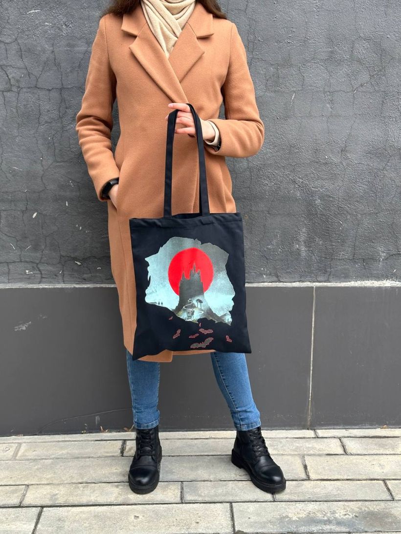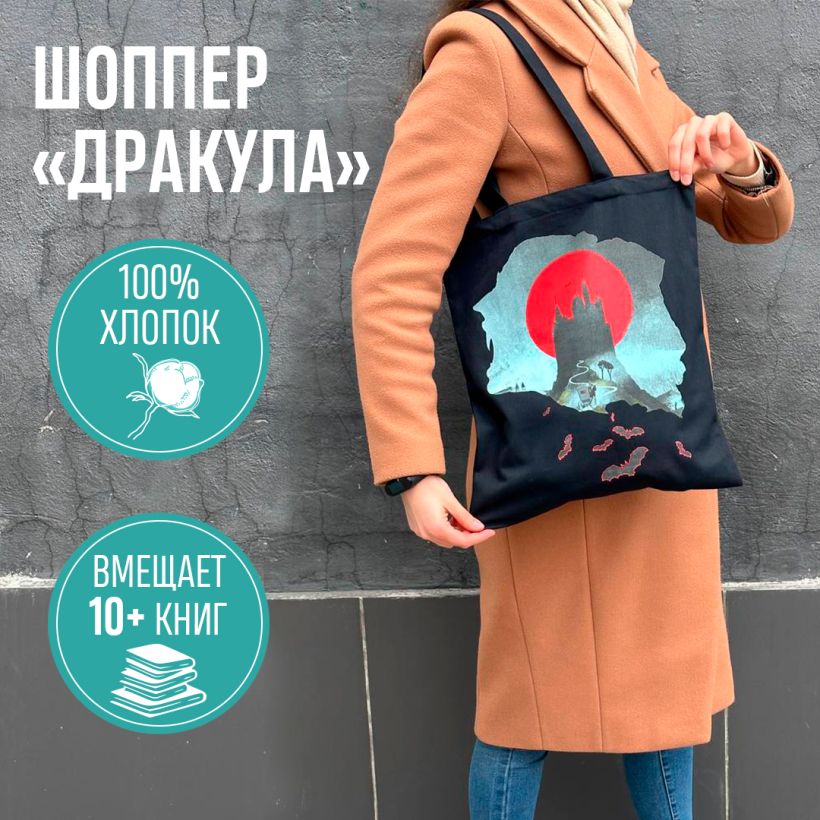 Сумка-шоппер «Замок Дракулы» сделана из плотного натурального хлопка и отличается износостойкостью. Удобная длина ручек. Иллюстрация на шоппере вдохновлена известным романом Брэма Стокера «Дракула» и отсылает к книжной серии «Белая птица». В шоппер поместится ноутбук с диагональю до 17 дюймов, папка формата А4. Также в сумку легко поместятся 7 книг серии «Белая птица», например, «Норвежский лес», «Цветы для Элджернона», «Коллекционер», «Шоколад», «Над пропастью во ржи», «451° по Фаренгейту» и «Вино из одуванчиков».