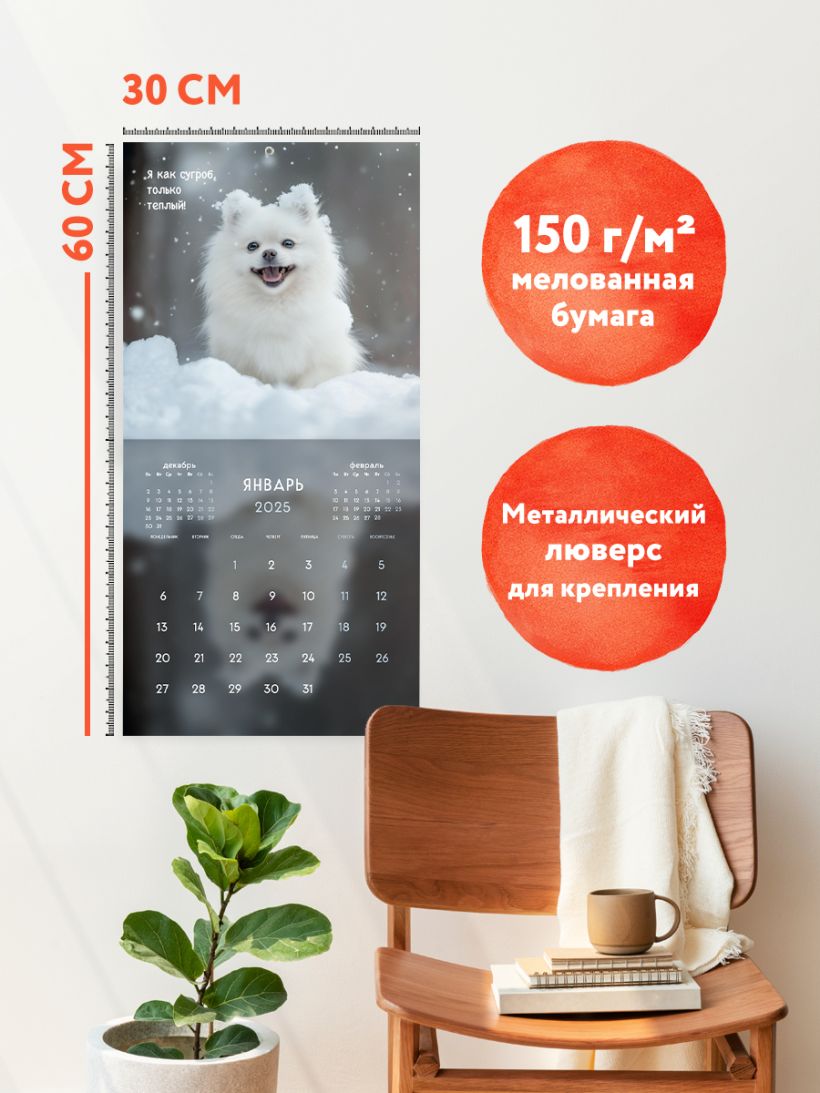 Забавный календарь с милыми шпицами, чьи изображения родились благодаря нейросети.