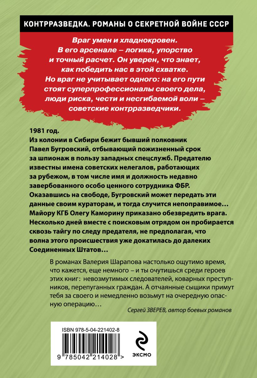 1981 год. Из колонии в Сибири бежит бывший полковник Павел Бугровский, отбывающий пожизненный срок за шпионаж в пользу западных спецслужб. Предателю известны имена советских нелегалов, работающих за рубежом, в том числе — имя и должность недавно завербованного особо ценного сотрудника ФБР. Оказавшись на свободе, Бугровский может передать эти данные своим кураторам, и тогда случится непоправимое… Майору КГБ Олегу Каморину приказано обезвредить врага. Несколько дней вместе с поисковым отрядом он пробирается сквозь тайгу по следу предателя, не предполагая, что волна этого происшествия уже докатилась до далеких Соединенных Штатов…