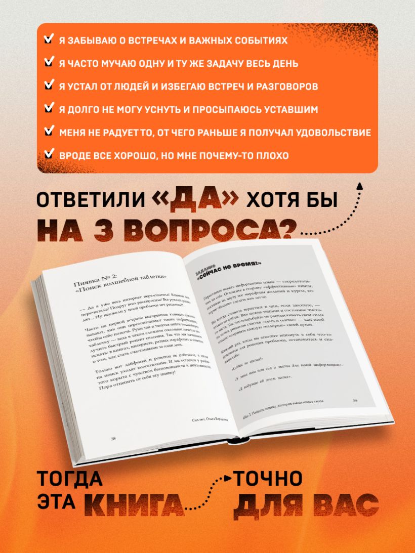 «В этой книге мы не будем разбираться, почему вы выгорели. Не будем копаться в ваших детских травмах — и проводить миллион психологических тестов. Я знаю, что вы устали. Сильно устали. И хотите быстрее вернуться в колею.