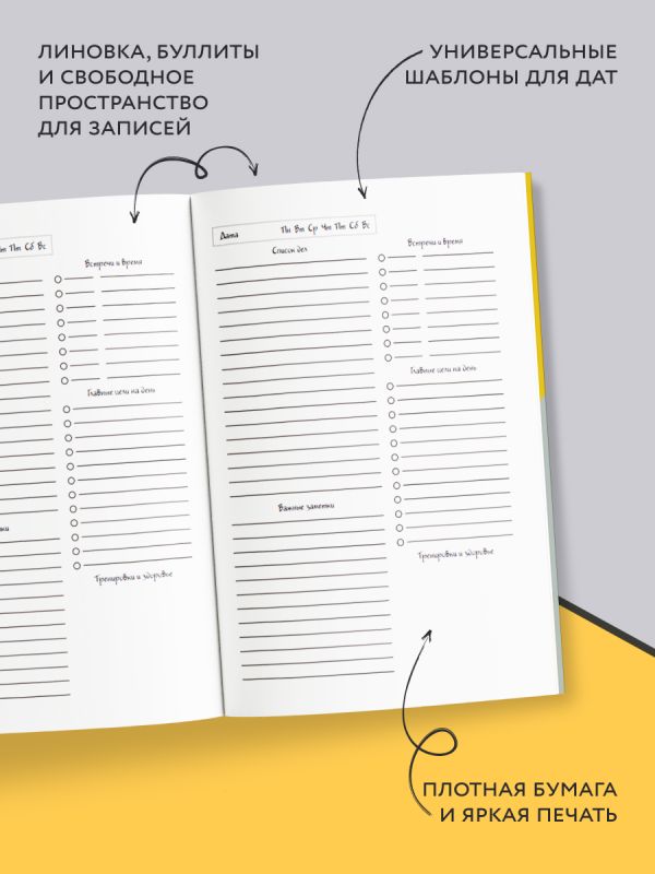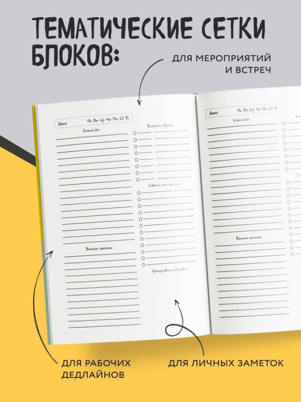 - Сетка блока создана с учетом современных тенденций европейского дизайна: часть распределена по времени — для рабочих дедлайнов, часть — линейки, которые можно использовать как для личных заметок, так и для планирования рабочих задач.