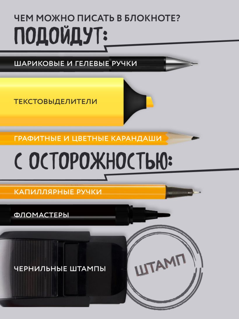- Белая плотная бумага внутри — не бликует, не просвечивает, выдерживает даже маркерные хайлайтеры.