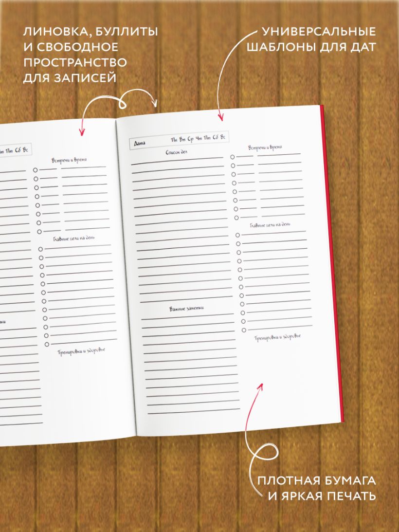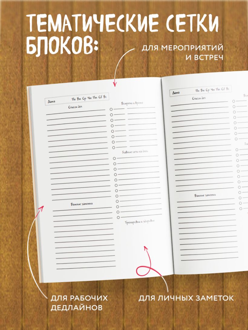- Сетка блока создана с учетом современных тенденций европейского дизайна: часть распределена по времени — для рабочих дедлайнов, часть — линейки, которые можно использовать как для личных заметок, так и для планирования рабочих задач.