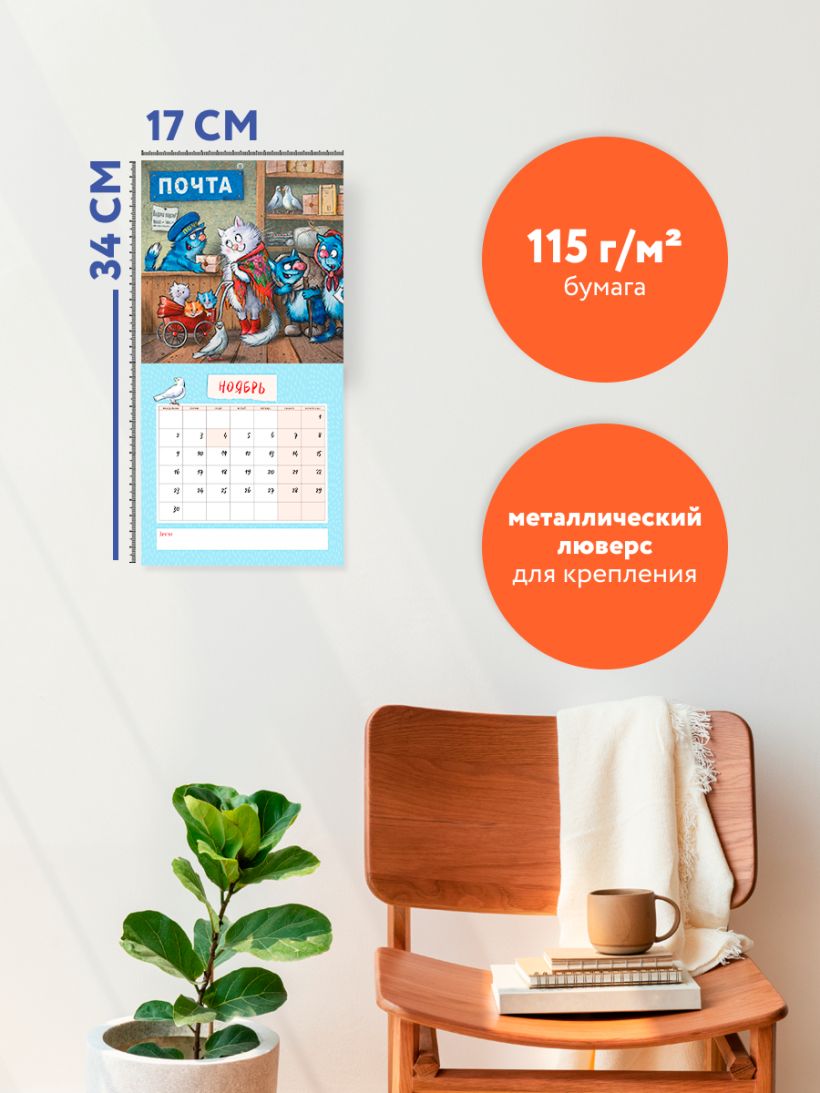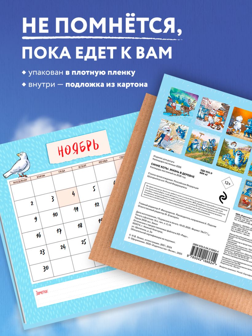 О серии: Наши настенные календари отличаются высоким качеством исполнения! Тщательно подобранные иллюстрации, напечатанные на глянцевой бумаге высочайшего качества, станут настоящим украшением дома, а в календарной сетке найдется место для ваших планов: большие клетки позволят делать записи и организовать свой год! В календаре также отмечены все государственные праздники. О календаре: Забавный милый календарь с зарисовками из жизни многодетной семьи знаменитых Синих Котов, завоевавших любовь тысяч поклонников в различных интернет-сообществах. Рина Зенюк — минская художница, герои ее рисунков — веселые и серьезные, решительные, мечтательные, очень упитанные коты синего цвета — понравятся не только заядлым любителям котиков, но и тем, кто до этого был к ним равнодушен. Свой жанр художница определяет как «котизм». Синие коты гарантированно дарят хорошее настроение и не оставят равнодушным никого! Для кого: Для всех поклонников творчества Рины Зенюк и ее замечательных синих котов! Технические параметры: Тип календаря — настенный перекидной Год — 2026 Календарная сетка — с разбивкой по месяцам Вид скрепления — скрепка Ширина — 17 см Высота — 17 см Внутренний блок — мелованная бумага 115 г/м2 Подложка — плотный гофрокартон для поддержания формы Индивидуальная упаковка в плотный целлофановый пакет.