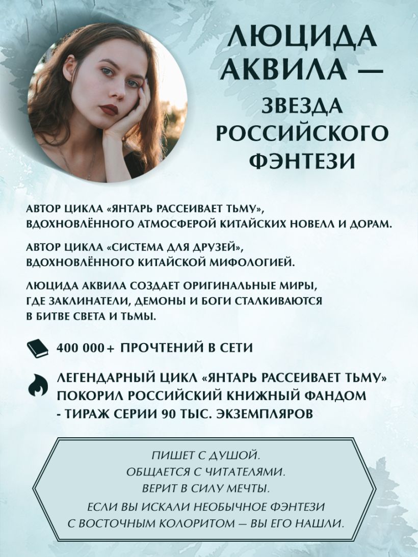 Потрясающее азиатское фэнтези про попаданцев Люциды Аквилы, чей цикл «Янтарь рассеивает тьму» покорил российский книжный фандом! «Система для друзей» — авторское прочтение мифов о Гуань-ди, китайском Боге Войны, и Яньло-ване, владыке Диюя. Школа Нефритовой печати; монстры и демоны; боевые сражения; демонические секты.