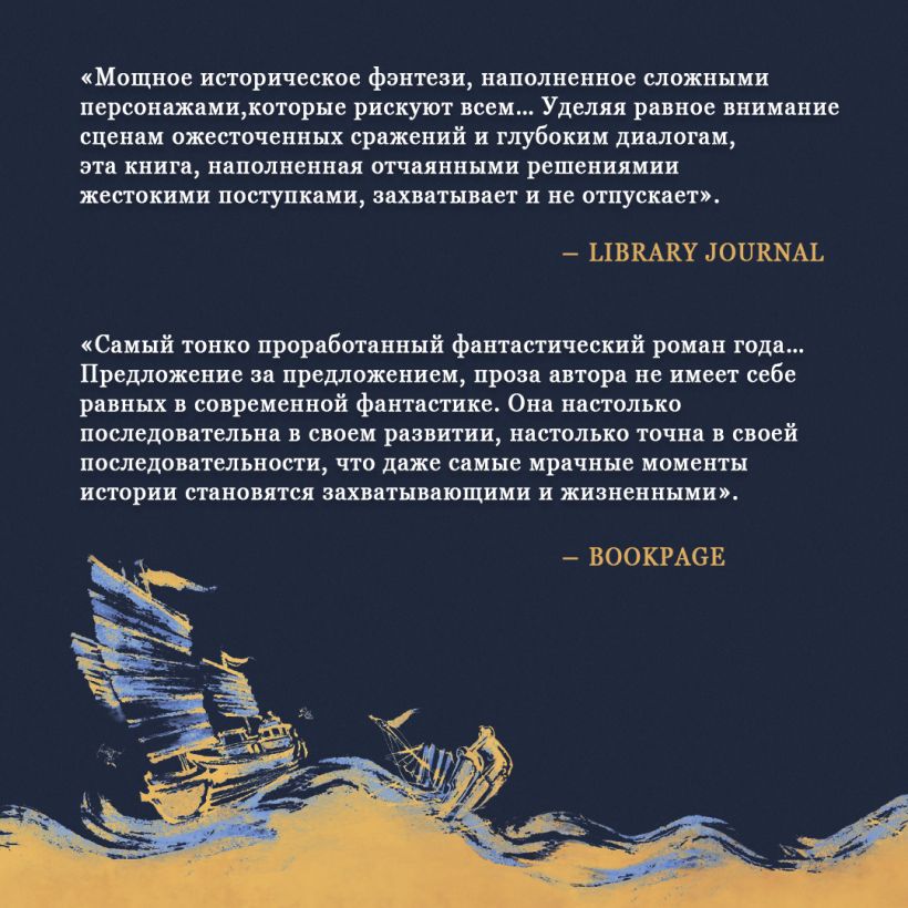 «Мощное историческое фэнтези, наполненное сложными персонажами, которые рискуют всем… Уделяя равное внимание сценам ожесточенных сражений и глубоким диалогам, эта книга, наполненная отчаянными решениями и жестокими поступками, захватывает и не отпускает». ― Library Journal