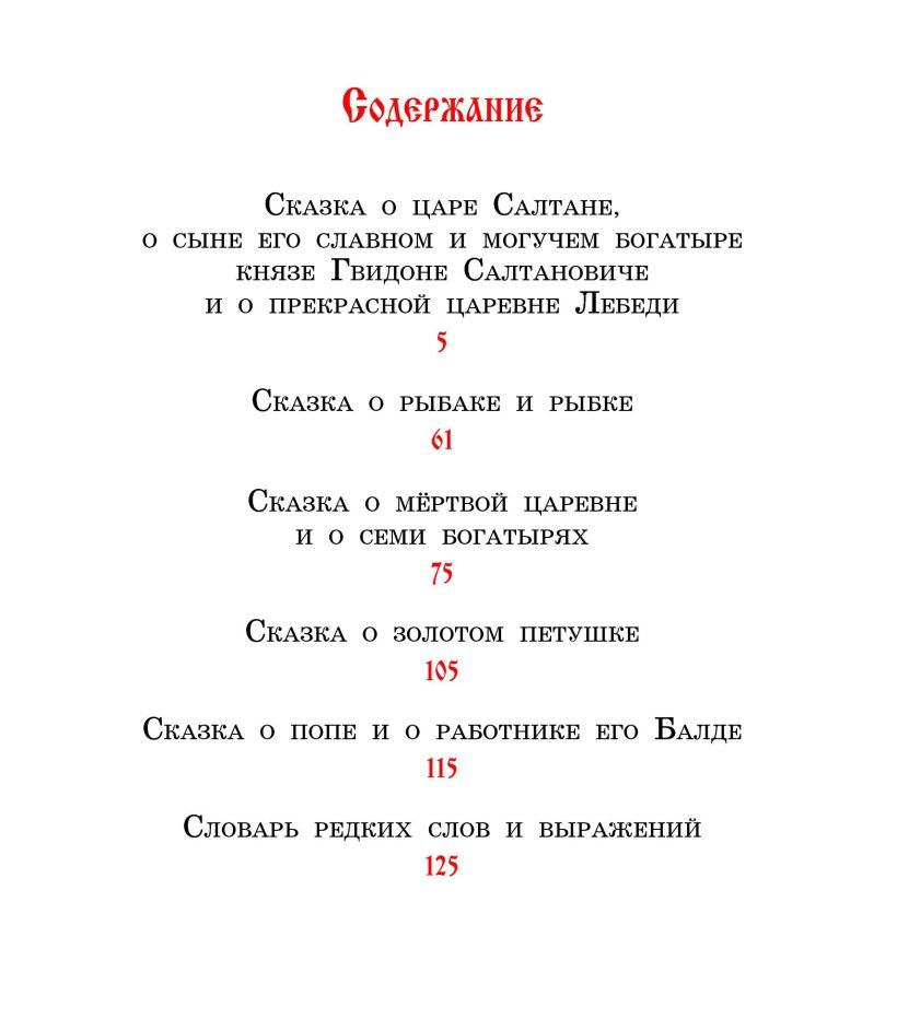 В сборник вошло пять сказок Александра Сергеевича Пушкина: «О рыбаке и рыбке», «О мертвой царевне и семи богатырях», «О царе Салтане», «О попе и работнике его Балде», «О золотом петушке».