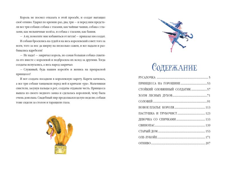 • Самые известные герои Ганса Христиана Андерсена поселились на страницах этой книги: русалки из тёмных глубин поют волшебные серенады, Оле-Лукойе с волшебными зонтиками приносит сны детям, принцесса пытается устроиться поудобнее на кровати с горошиной, а оловянный солдатик стойко несёт свою службу.