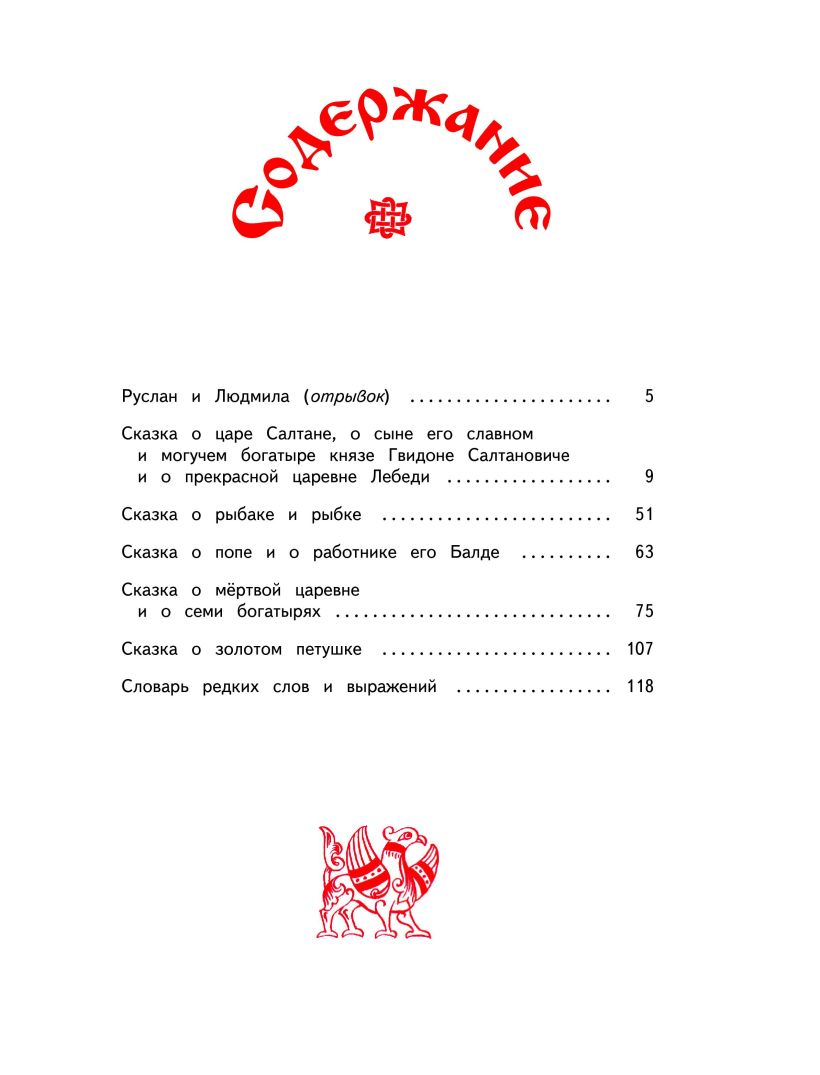 В книгу вошли «Сказка о царе Салтане, о сыне его, славном и могучем богатыре князе Гвидоне Салтановиче, и о прекрасной царевне Лебеди», «Сказка о рыбаке и рыбке», «Сказка о попе и о работнике его Балде», «Сказка о мёртвой царевне и о семи богатырях», «Сказка о золотом петушке», а также фрагмент из поэмы «Руслан и Людмила» «У Лукоморья дуб зелёный…».