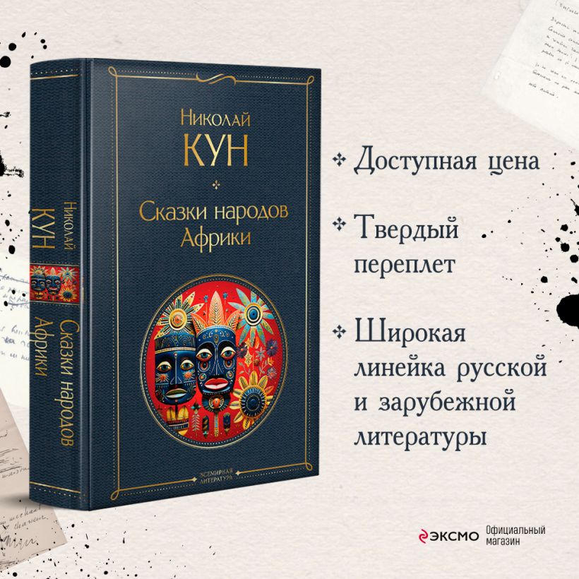 Николай Альбертович Кун (1877—1940) — писатель, историк и педагог, автор популярной книги «Легенды и мифы Древней Греции». Не менее интересен и сборник «Сказки народов Африки». В нем Николай Кун собрал истории готтентотов, зулусов, кафрских народов, бечуанов, овагереросов, сомалийцев, суданских негров и некоторых других народностей Африки. В дополнение к сказкам писатель дает развернутое описание каждого племени, в котором объясняет особенности мест обитания, истории и жизненного уклада. Издание дополняют черно-белые иллюстрации и фотографии.