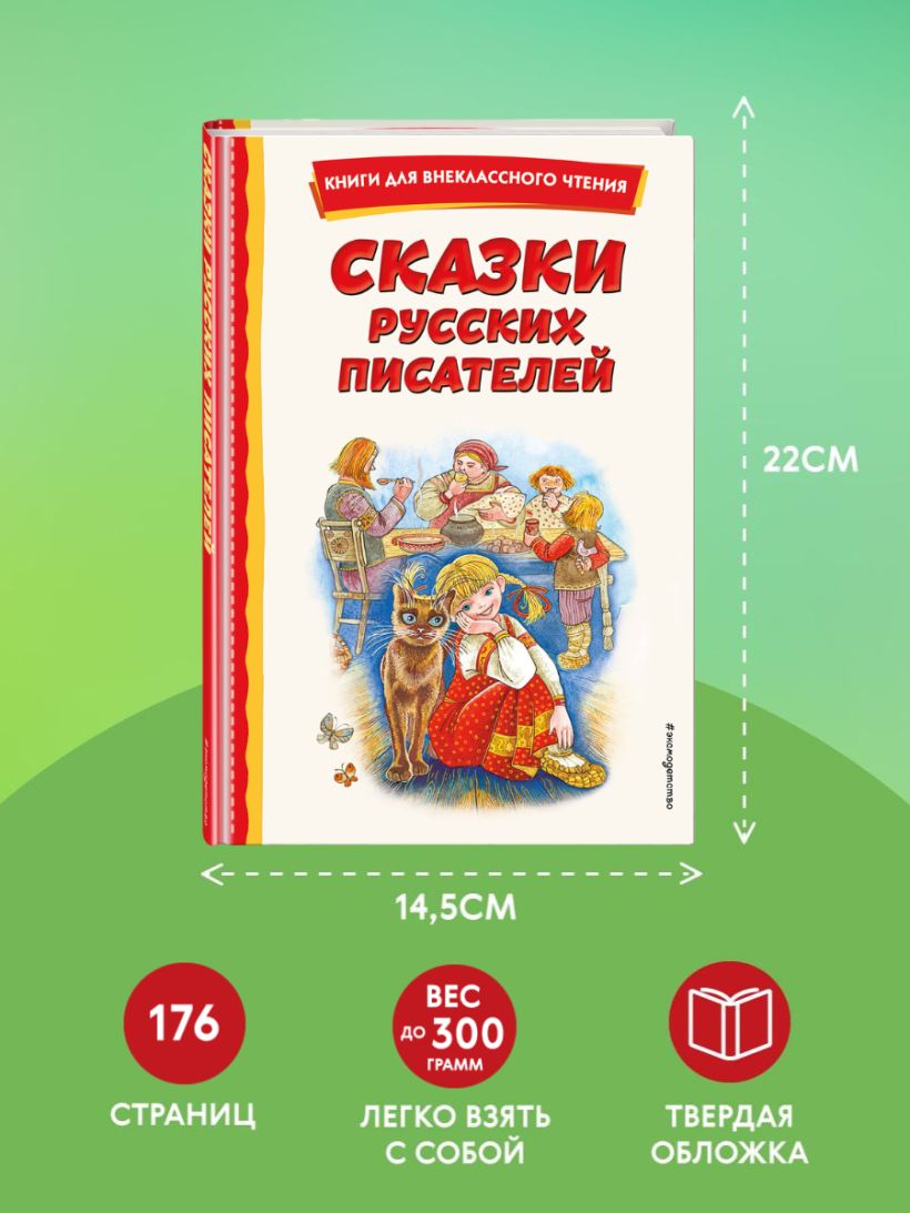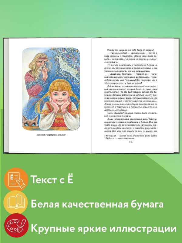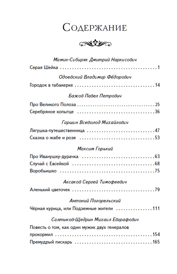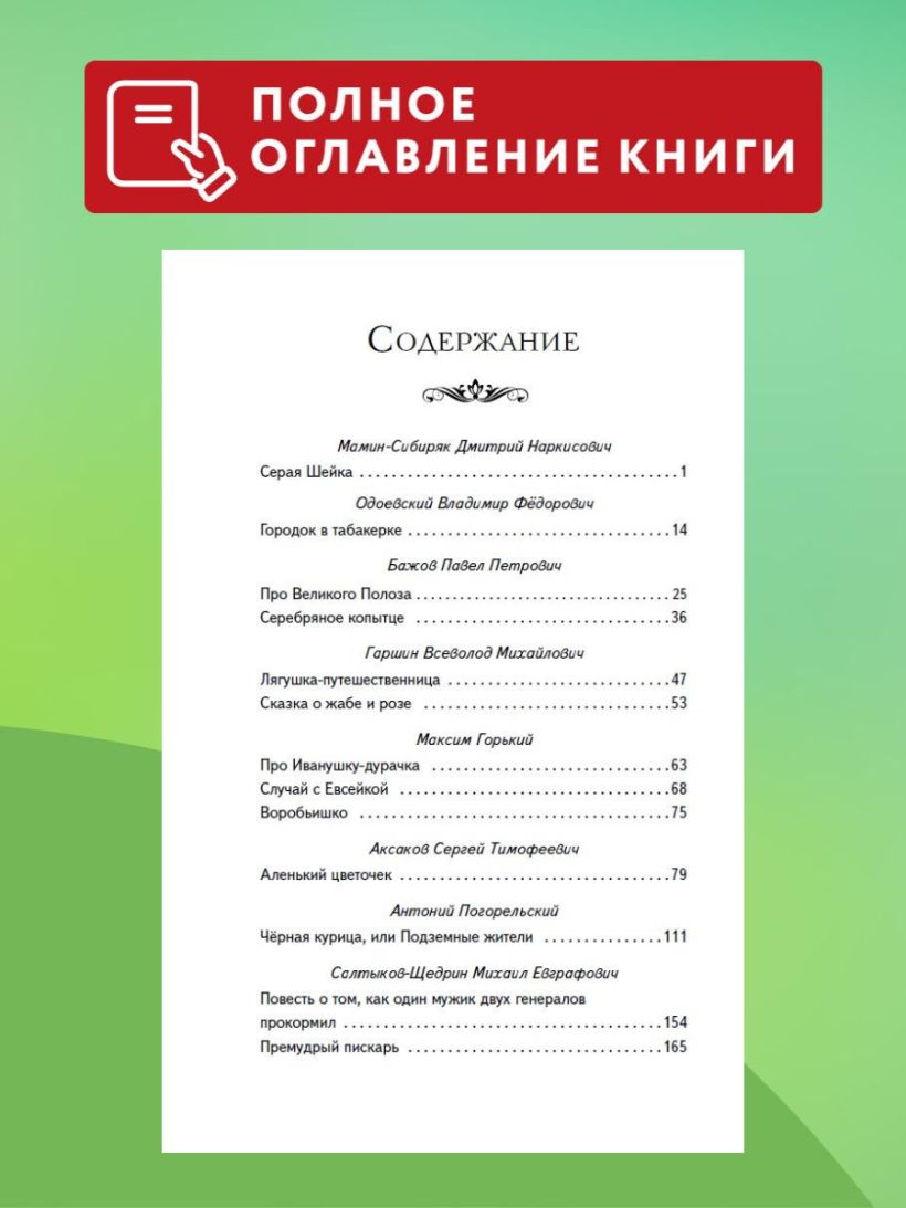 В этой книге представлены сказки великих русских писателей, написанные на основе оригинальных и народных сюжетов, в том числе «Серая шейка» Д.Н. Мамина-Сибиряка, «Городок в табакерке» В.Ф. Одоевского, «Серебряное копытце» П.П. Бажова, «Аленький цветочек» А. Погорельского и др.