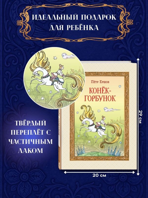 Забавный и шустрый конёк-горбунок — верный, надёжный и, конечно, волшебный спутник Иванушки — один из самых любимых сказочных героев, с которыми мы знакомимся в детстве. Звонкие, радостные строки известной сказки Петра Ершова надолго остаются в памяти, а их лёгкий ритм словно подсказывает юным читателям: самые невероятные приключения обязательно закончатся хорошо!