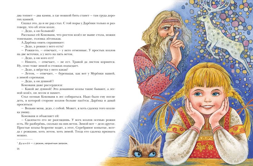 Яркие и самобытные уральские сказы Павла Бажова. Их герои — честные и отважные люди, которые попадают в необычные сказочные обстоятельства. Чего только не встретится им на пути! То Степан повстречает Хозяйку Медной горы, и превратится она в ящерку юркую, то мальчики Ланко и Лейко попытаются обхитрить Голубую змейку, да только злые помыслы к хорошему не приводят, то сиротка Дарёнка с Кокованей увидят козлика с серебряным копытцем, что оставляет после себя драгоценные хризолиты. Произведения хранят в себе особую атмосферу уральских земель, где суровая действительность уклада жизни простых людей пронизана сказочным духом и неуловимой красотой.