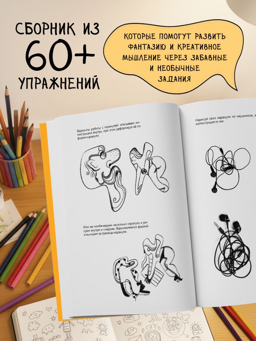 Перед тобой — сборник из 60+ упражнений, которые помогут развить фантазию и креативное мышление через забавные и необычные задания. Каждое из них сопровождается подробными объяснениями и иллюстрациями, чтобы было можно легко понять, как его выполнить. На ее страницах ты нарисуешь целые города и бесконечное количество персонажей, научишься работать с композицией и создавать образы из клякс и пятен, поэкспериментируешь с цветом и текстурой.