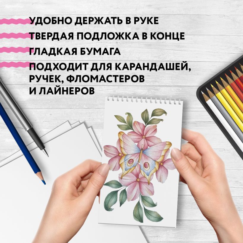 Не представляете своей жизни без искусства? Яркий и стильный карманный блокнот для рисования вдохновит вас на новые идеи, а твёрдая подложка в конце блокнота позволит использовать его как миниатюрный планшет-скетчбук.