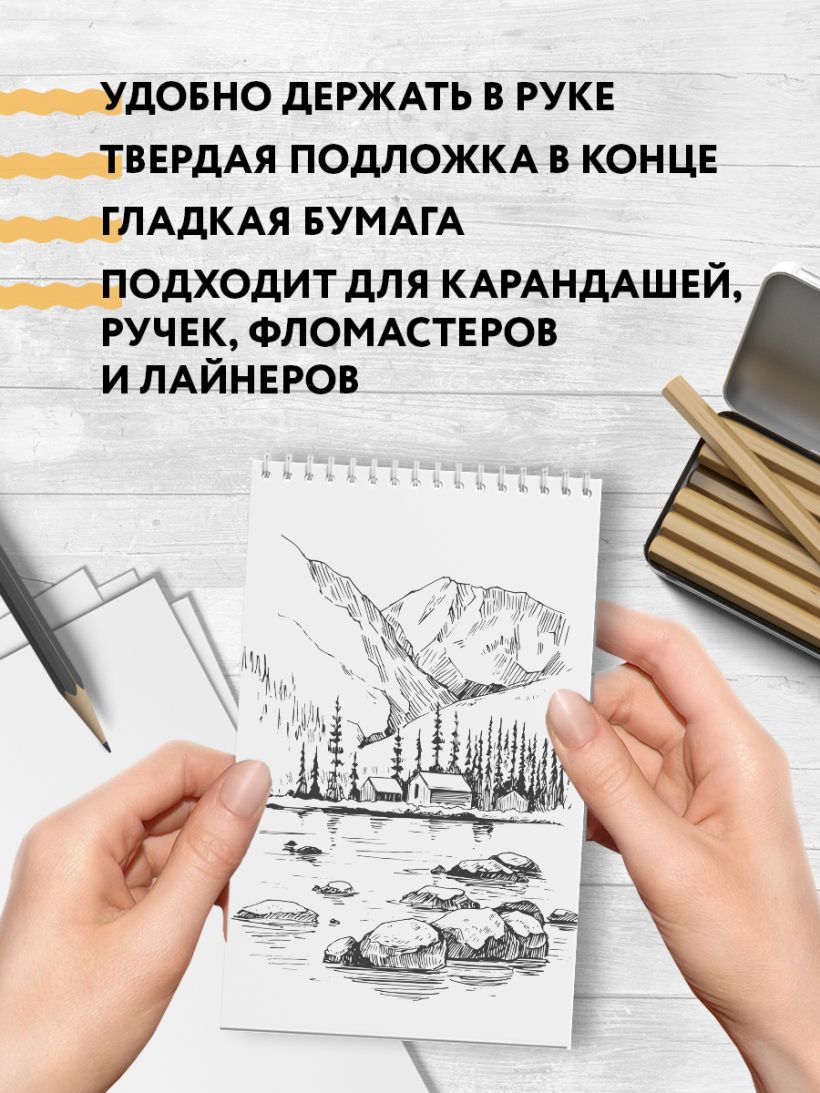 Не представляете своей жизни без искусства? Яркий и стильный карманный блокнот для рисования вдохновит вас на новые идеи, а твёрдая подложка в конце блокнота позволит использовать его как миниатюрный планшет-скетчбук.