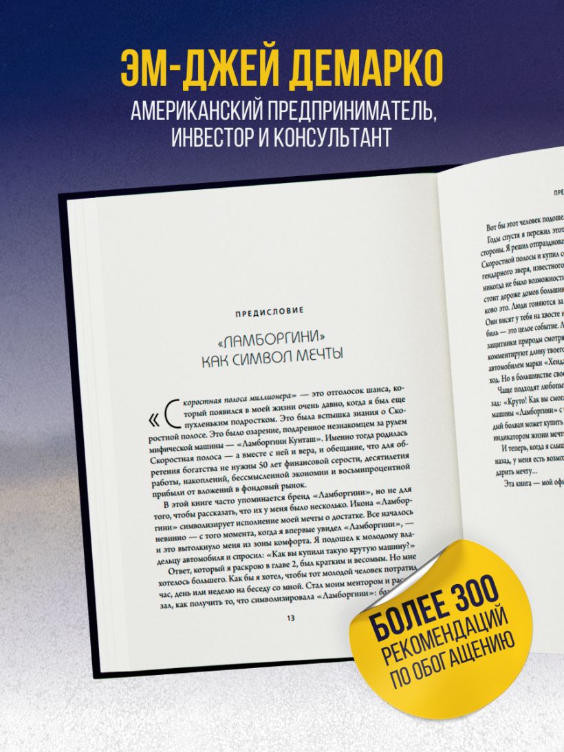 Долго считалось, что создание богатства требует много времени. Получи диплом, всю жизнь работай, откладывай по 10% от зарплаты, и годам к шестидесяти пяти, возможно, ты станешь состоятельным человеком. А может, и нет — как повезет. Автор этой книги предлагает другой путь. Эм-Джей ДеМарко, американский предприниматель, инвестор и консультант, называет его «СКОРОСТНАЯ ПОЛОСА МИЛЛИОНЕРА». Это целостная психологическая и математическая формула, которая взламывает код финансовой свободы. В своей книге ДеМарко дает свыше 300 рекомендаций по обогащению в короткие сроки, то есть за 5—10 лет.